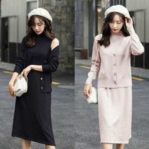 피어니스트 여성용 긴팔 심플 무지 나시 + 가디건 투피스 세트