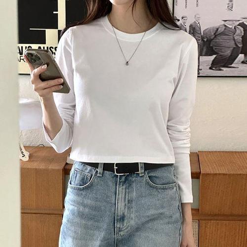 [유야]여성 면 무지 라운드 세미 크롭 긴팔 티셔츠 -FTS0527- 봄 가을