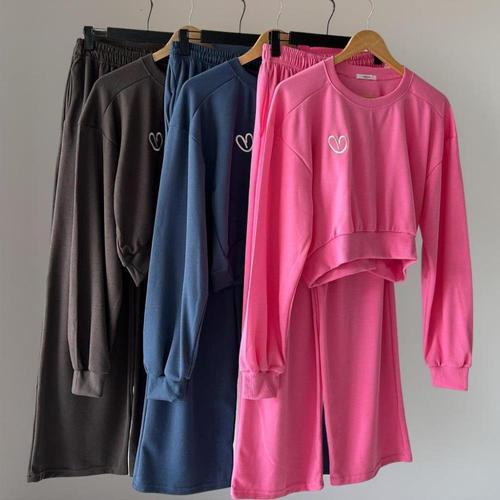 [신상오픈런]여성 하트 자수 크롭 티셔츠와 가을 트레이닝 바지 세트