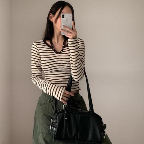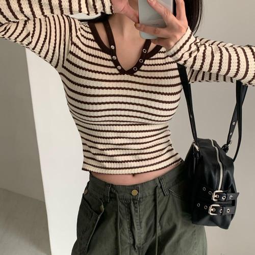[신상오픈런]여성 스트라이프 크롭 긴팔 티셔츠 아일렛 컷팅 스판 가을용