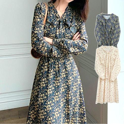 [오너클랜]인기상품 쉬폰 플라워 프린트 롱원피스 셔링 긴팔 봄 가을 A라인 드레스 [WFLL944_260304]