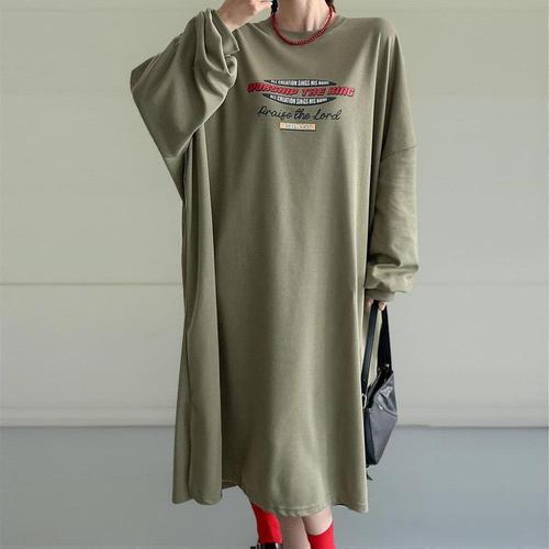 [유야]캐주얼 레터링 면 라운드 긴팔 롱 원피스 홈웨어 꾸안꾸 -OP0510H- 빅사이즈 루즈핏 여성 가을