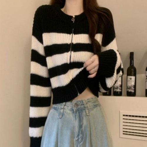 [엄지척]여성 세미크롭 단가라 배색 니트 집업 간절기 아우터_19806109_667501