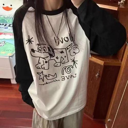 [에이치플러스몰]여성 오버핏 강아지캐릭터 배색 포인트 긴팔티셔츠