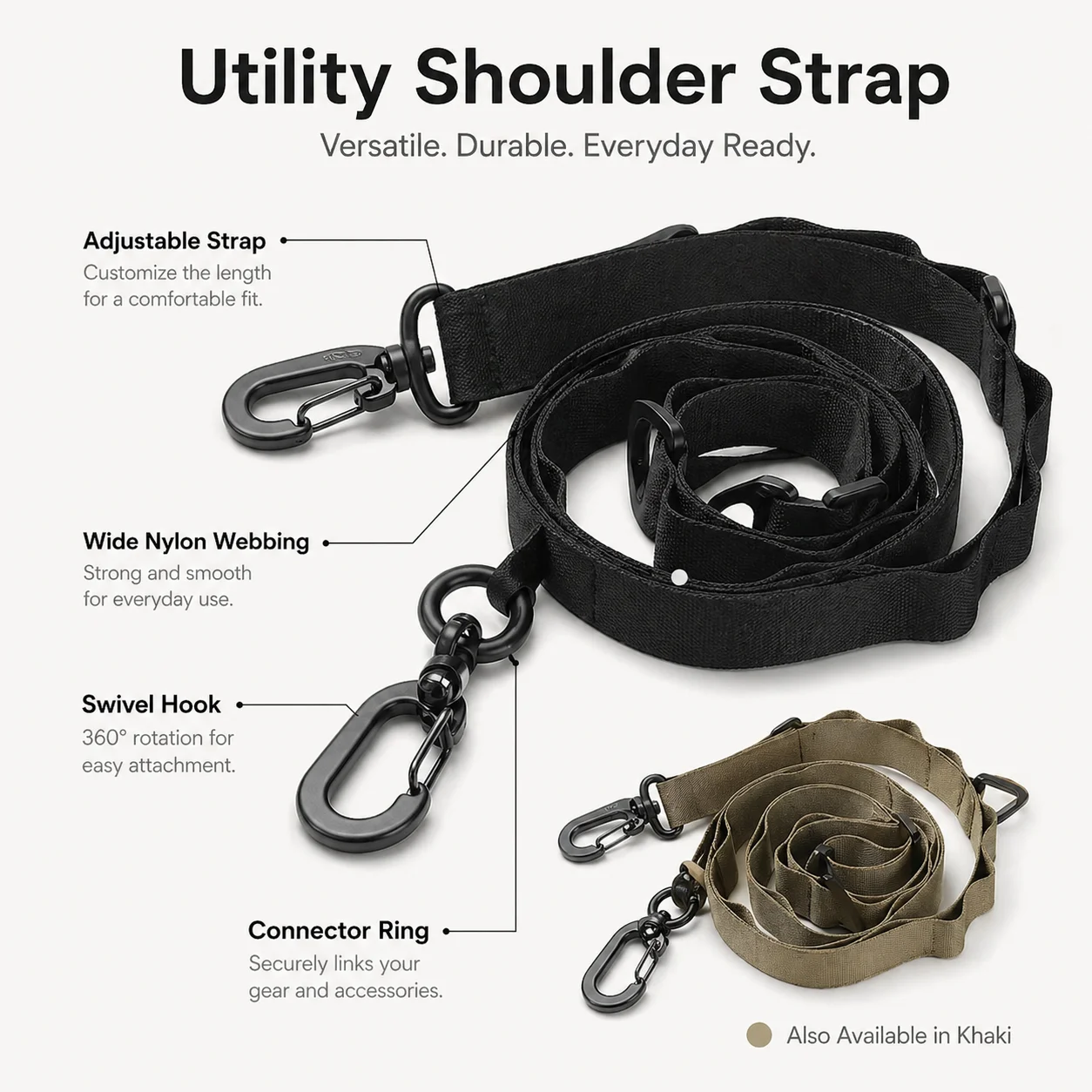 유틸리티 숄더 스트랩, 회전형 후크가 있는 조절 가능한 나일론 크로스바디 스트랩, 열쇠, 파우치, 병, 카메라용 넓은 웨빙 스트랩