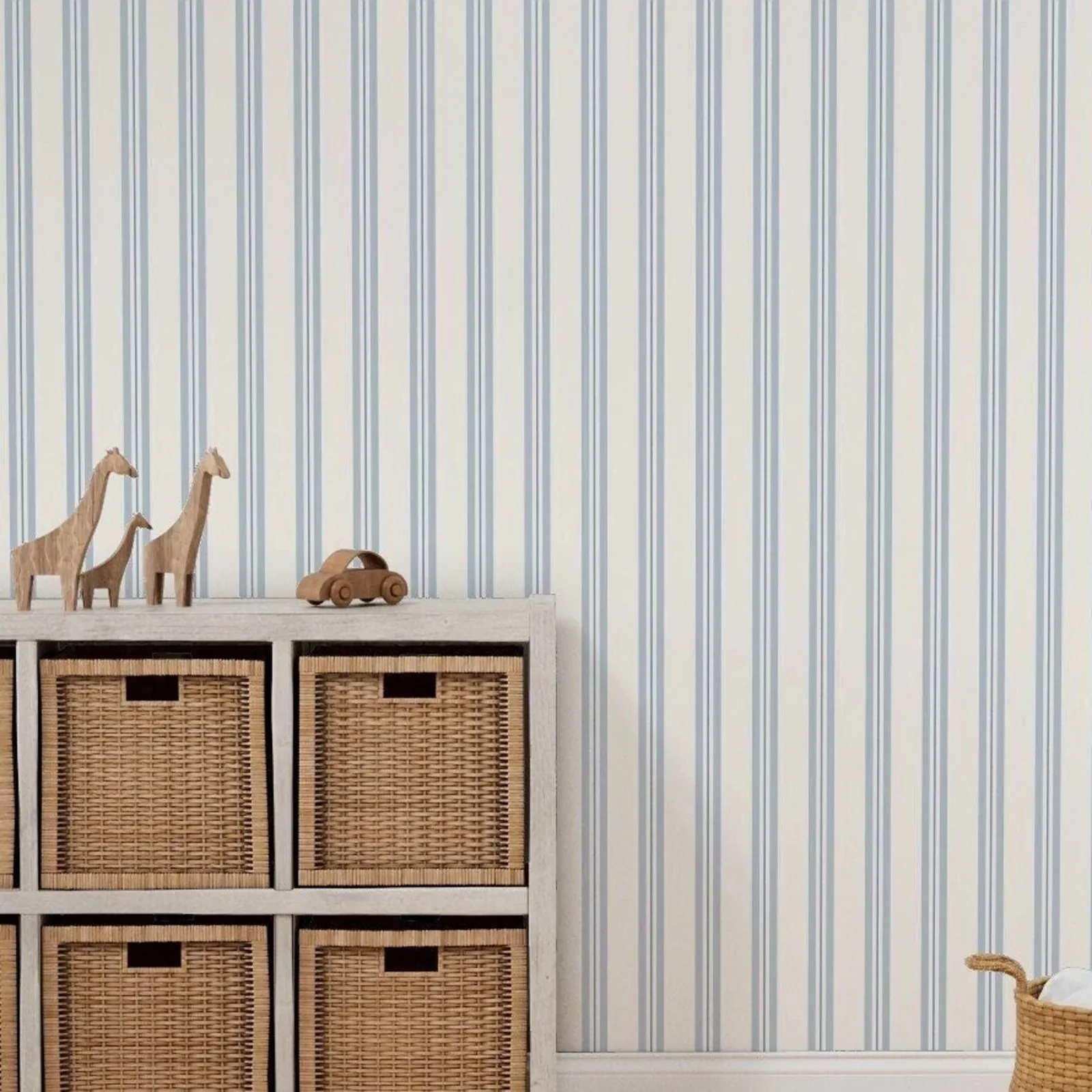 파란색 틱킹 줄무늬 벽 벽화, 소년 침실 보육을 위한 파란색 줄무늬 벽지, 자체 접착 또는 붙여넣기 없는 벽 종이 롤.