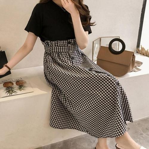 [오너클랜]인기상품 여자 검정 반팔티 허리밴딩 체크 스커트 투피스 세트 [WEEA1D9_250918]