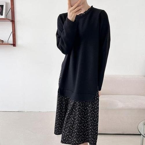 [다잇템][다잇템] 여자 검정 기모원피스 큰사이즈 프릴넥 꽃무늬 롱원피스_23889873_588872
