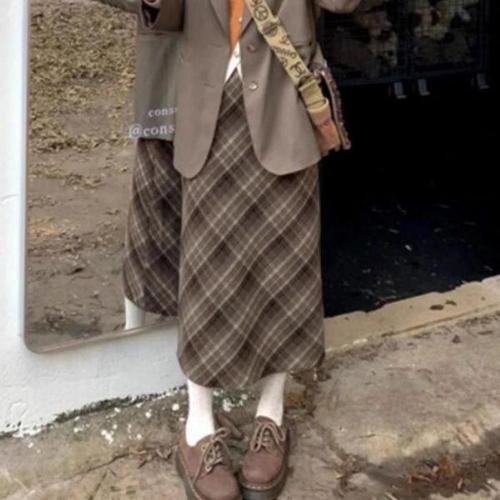 여성 빈티지 스커트 가을 롱 겨울 치마 허리 체크 밴딩