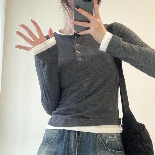 [옷자락] [시즌오프]레이어드 버튼 배색 라운드넥 속기모 겨울 티셔츠_5
