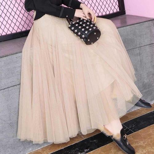 결혼식 하객 룩 모임 여성 망사 샤 플레어 롱 스커트 WFKBW9I