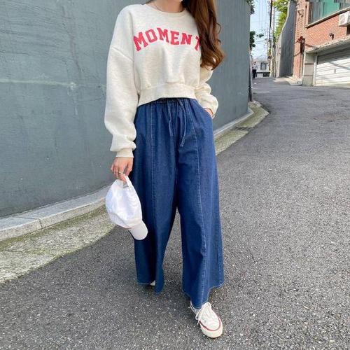 [다잇템]여자 자수 개강룩 와이드핏 고무줄 펌킨 청바지