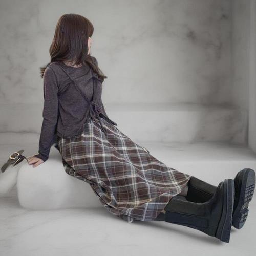 [다잇템]여성 고무줄 혁대 후레아 격자 롱 스커트