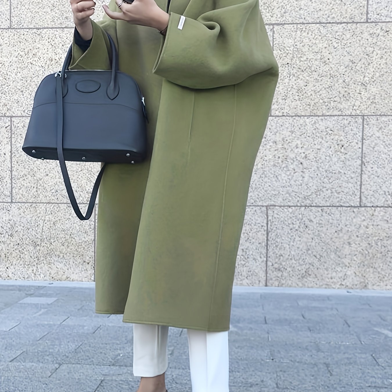 TEMU 1pc 우아한 여성용 스탠드 칼라 긴팔 튜닉 코트, 대비 버튼 디테일 - 폴리에스터 싱글 브레스트 단색 롱 아우터웨어, 모든 계절에 적합