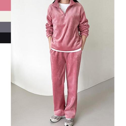 [의류] 여성 기모 안감 반집업 상의 골덴 와이드핏 바지 세트
