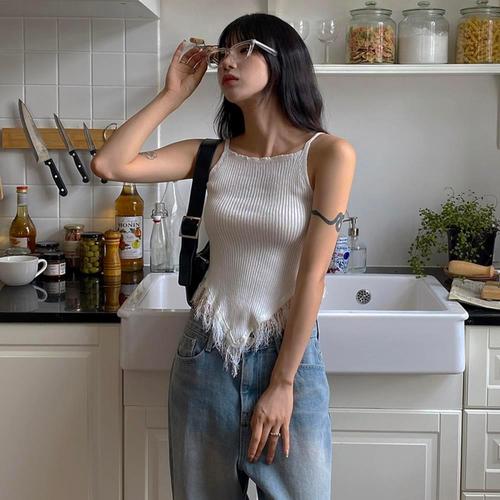 [옷자락] 여자 브이 컷팅 프린지 골지 끈 나시
