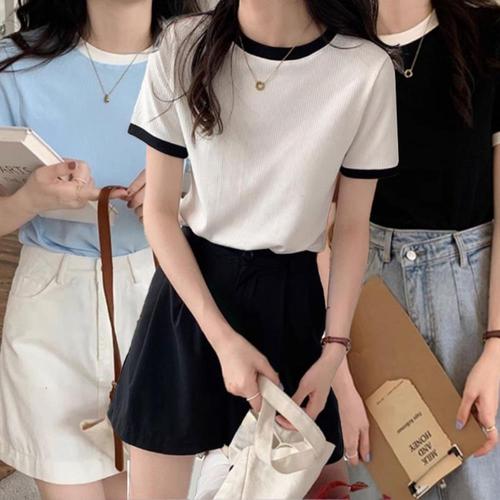 [옷자락]여자 스트라이프 골지 넥 소매 배색 반팔 티셔츠