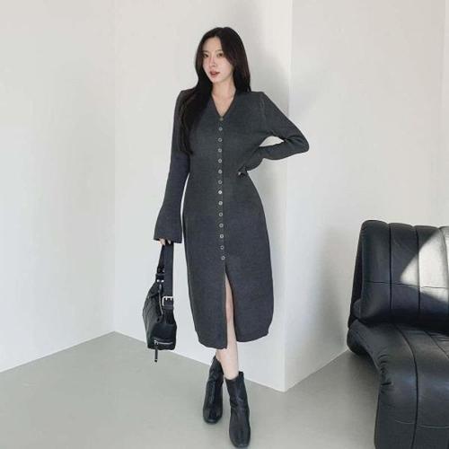 [다잇템]여성 골지 롱 V넥 슬릿 단추 슬림핏 드레스