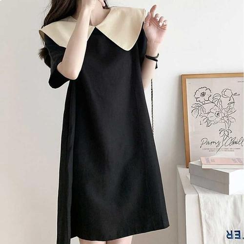 [오노마] ONM 배색 와이드 카라 블랙원피스 뒷매듭끈 데이트 하객룩