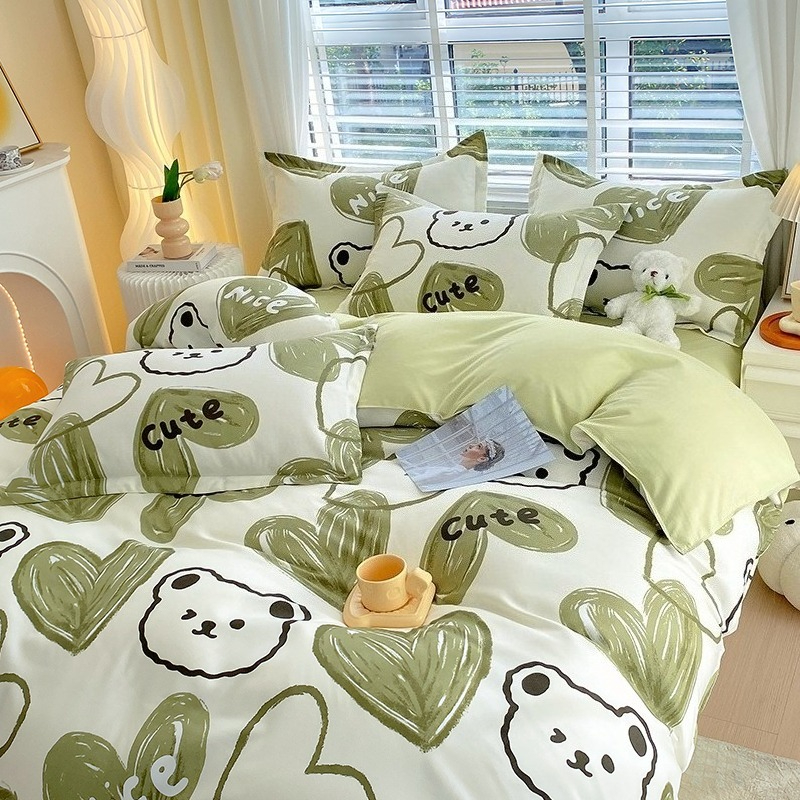TEMU 4개 그린 하트와 귀여운 곰돌이 패턴 침구 세트 | 이불 커버 1개, 침대 시트 1개, 베갯잇 2개 포함 | 폴리에스터, 세탁기 사용 가능, 사계절 사용