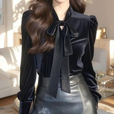 유니픽 여성 가을겨울 벨벳 리본 블라우스 우아한 긴팔 상의cc