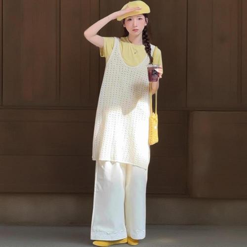 |CCJ6544|여성 여름 레이어드 그물 펀칭 트임 긴 베스트