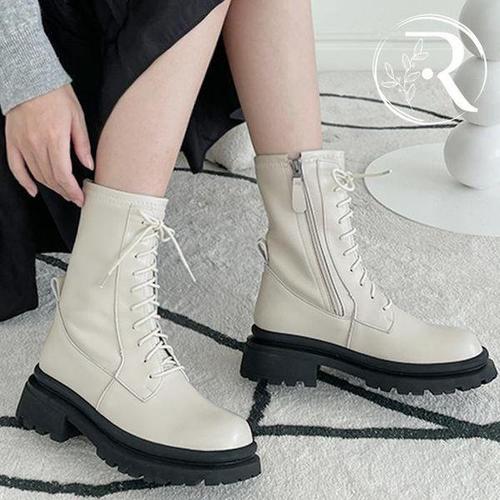 여성 2컬러 레이스업 앵클부츠 통굽 플랫 통굽워커