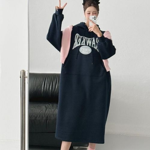 플러리싱 / 기모 후드 레터링 루즈핏 롱 원피스 플러리싱
