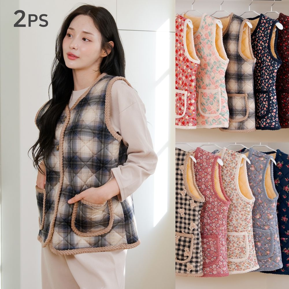 필굿 할머니조끼 2P세트 꽃무늬 꽃가라 기모 누빔 양털 김장조끼 레트로패션 촌캉스룩 엄마 아줌마 복고 몸빼