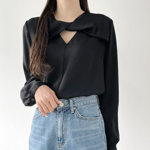 레티고 카라 브이넥 크로스 꼬임 긴팔 셔츠 블라우스