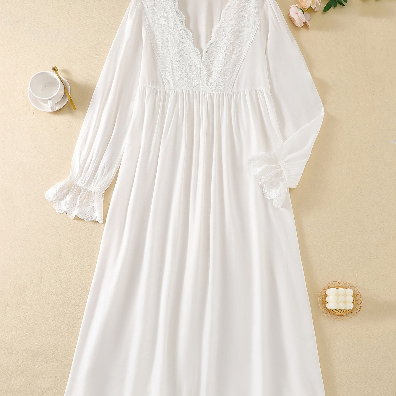 TEMU 여성용 V넥 긴팔 나이트 드레스, 프랑스 스타일 달콤한 캐주얼 잠옷, 52% 비스코스 48% 폴리에스테르, 올 시즌 단색과 대비 레이스 디테일, 직조 직물, 103 gsm - 성인용