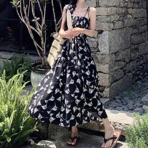 여름 꽃무늬 끈 드레스 여성용 루즈핏 민소매 프린트 바닥 원피스 여성용