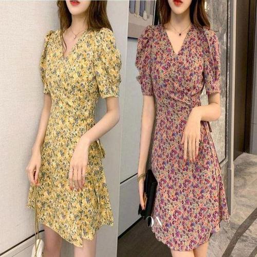 [셀러허브_여성트랜드패션]여자 원피스 랩 반팔 퍼프 청순 꽃무늬 V넥 소매