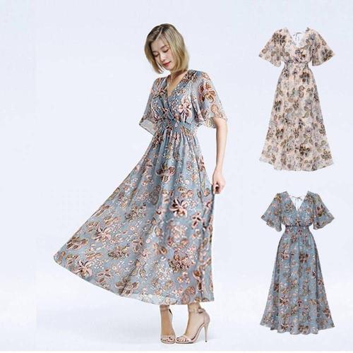 여름 쉬폰 꽃무늬 롱 원피스 반팔 여성 치마