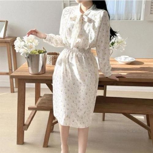 여성 긴팔 리본 롱 원피스 프릴 드레스 쉬폰 꽃무늬