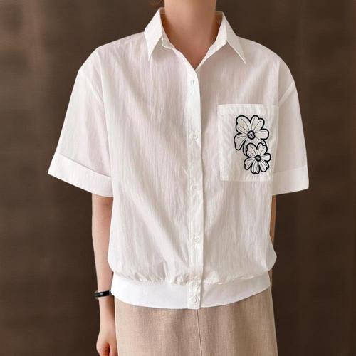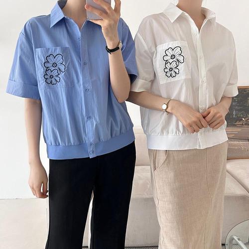 |CSH3EBF|여성 여름 셔츠 꽃 자수 포켓 롤업 반팔 블루 블라우스