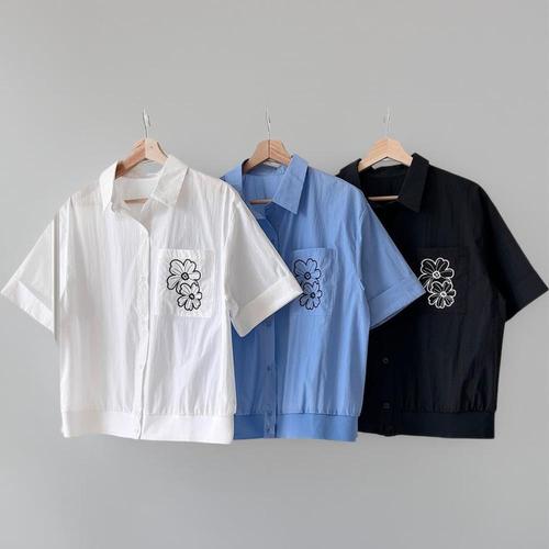 |CSH3EBF|여성 여름 블루 꽃 자수 포켓 롤업 셔츠