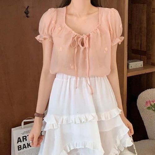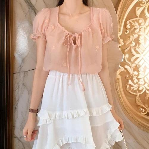 [신상오픈런]여성 꽃자수 프릴 콩단추 캡소매 셔링 블라우스