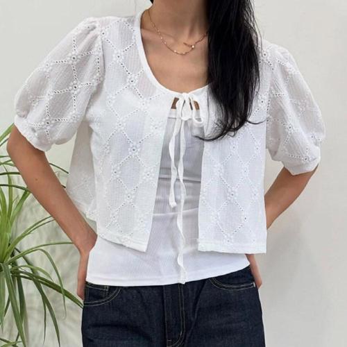 [다잇템]여자 꽃자수 펀칭 반소매 리본 크림색 블라우스
