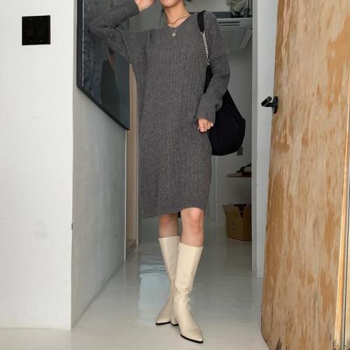 besteffie 가을신상 꽈배기 편한스타일 A라인 솔리드컬러 원피스 슬림핏 데일리룩 롱 긴팔원피스추천 U15
