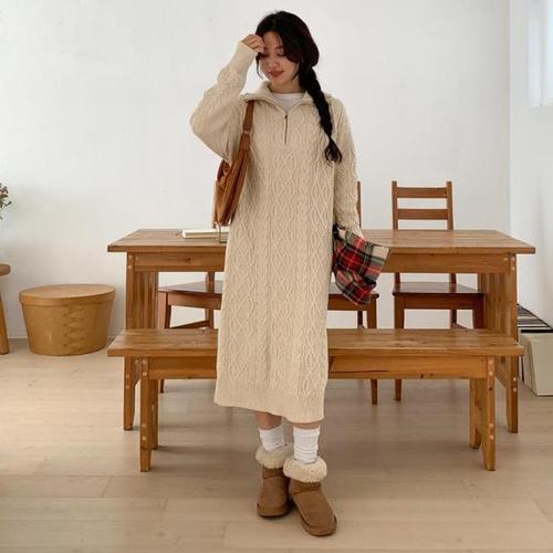 여성용 키치 꽈배기 하이넥 집업 니트 롱원피스