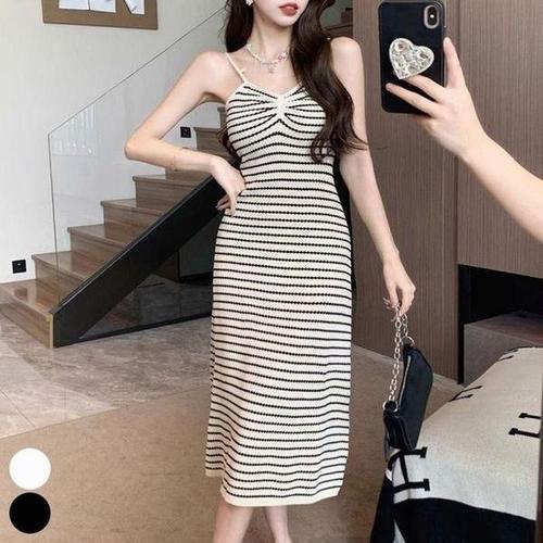 [셀러허브_여성트랜드패션]휴양지 원피스 롱 패션 여름 끈나시 니트 스트라이프