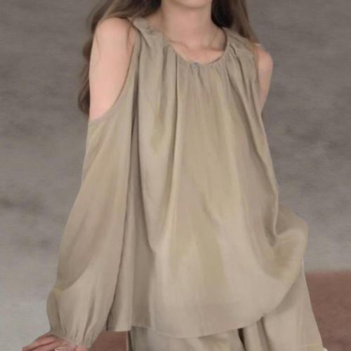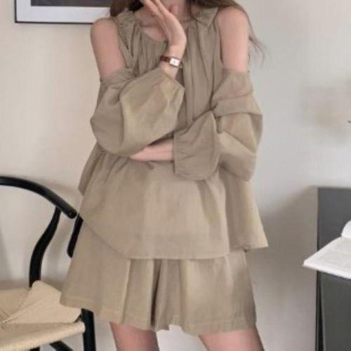 [신상오픈런]여성 셔링 어깨 트임 나시 블라우스와 반바지 세트