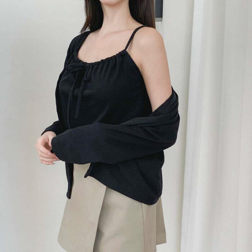 [옷자락] 여자 무지컬러 셔링 어깨끈 나시 크롭 가디건 세트