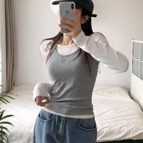 [미라클세븐]여성 레이어드 배색 홀터넥 나시 슬림핏 긴팔 티셔츠 세트
