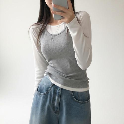 여성 루즈핏 스타일 슬리브리스 레이어드 긴팔 세트니트티셔츠 라운드 가을 겨울 골지 부드러운 슬림 여자