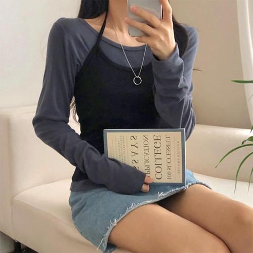 |KMD28B1|여성 레이어드 배색 홀터넥 나시 슬림핏 긴팔 티셔츠 세트