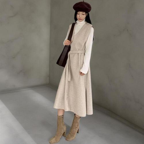 [다잇템]여성 폭신 롱 슬리브리스 혁대 색상 울 드레스