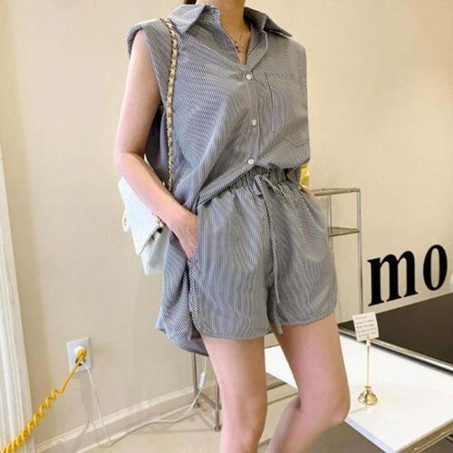 [옷자락]여자 스트라이프 민소매 셔츠 쇼츠 반바지 세트