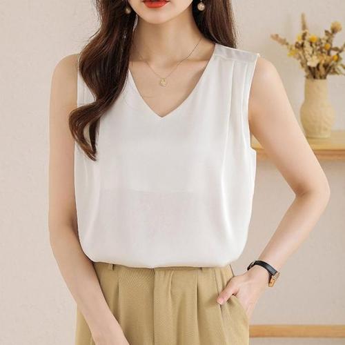[오너클랜]인기상품 핀턱 브이넥 민소매 블라우스 여유핏 무지 오피스룩 [WC69A08_250916]